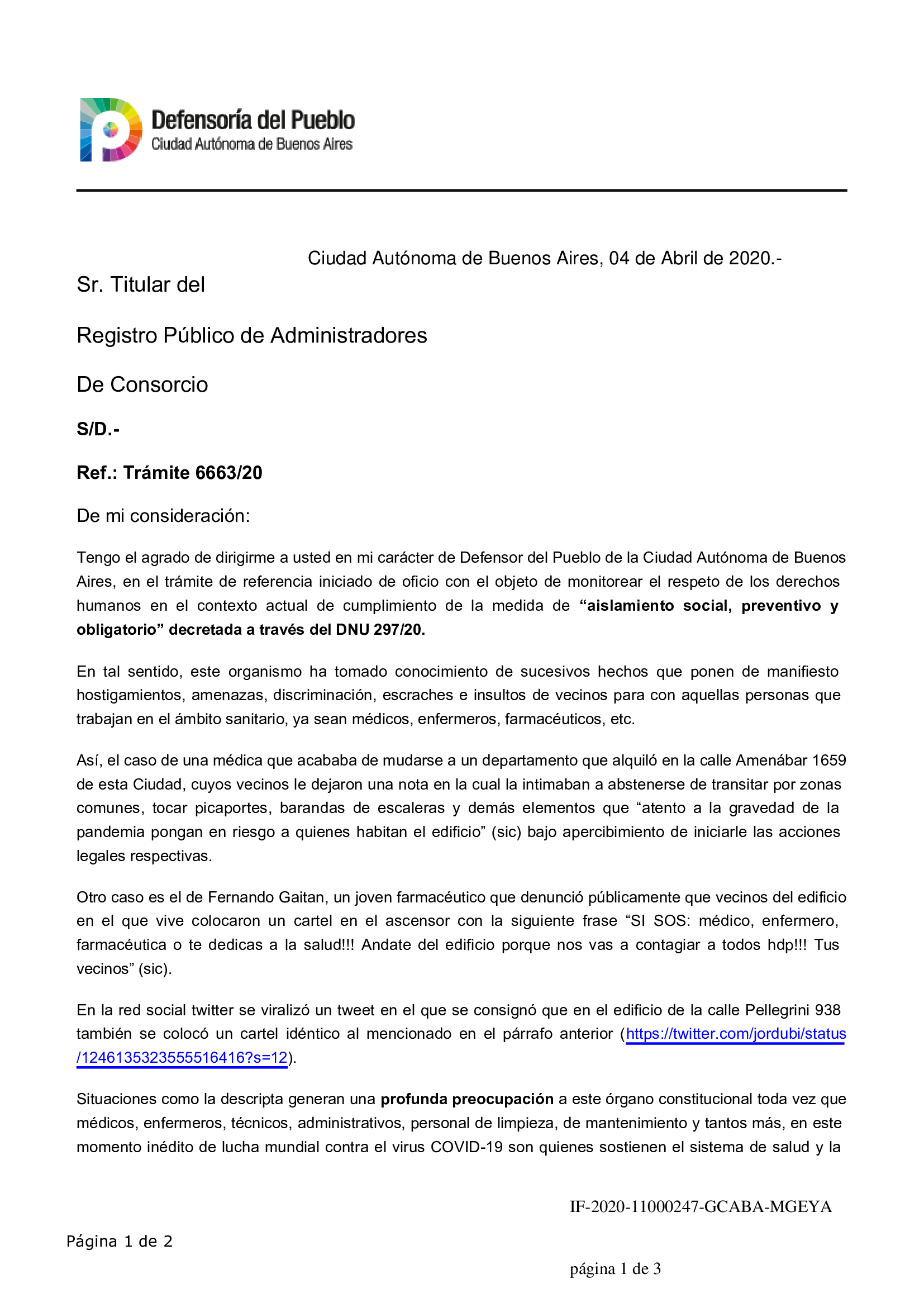 El Defensor del Pueblo de la Ciudad Autónoma de Buenos Aires, Alejandro Amor, le solicitó al RPA que con carácter de muy urgente y por su intermedio se instruya a todas las administraciones de consorcios registradas en esa dependencia a su cargo, para que notifiquen a todos los consorcios que administran el contenido de la presente, en particular que inste a la abstención de las acciones contra los Profesionales Sanitarios (amenazas, insultos, etc.) y que en caso de detectarlas las ponga en conocimiento de este organismo a los fines de iniciar las denuncias respectivas toda vez que podrían resultar constitutivas de delitos y/o contravenciones.